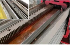 1.El puente de la cortadora está hecho de hierro fundido para garantizar rigidez y amortiguación de vibraciones mientras que el sistema de guías de fundición y cremalleras de diente recto en baño de aceite, nos aseguran fiabilidad, robustez y una larga vida útil.
