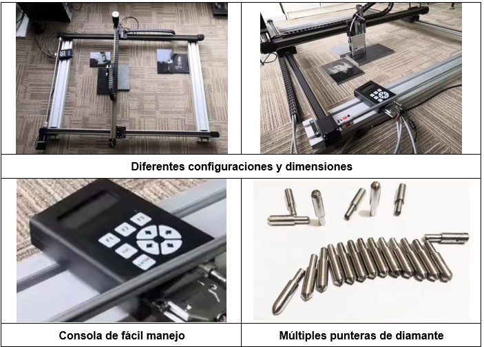 Este equipo de grabación de piedra 2D por impacto, permite realizar unos trabajos de gran calidad y precisión, en un tiempo reducido. A destacar la sencillez de su diseño, sin restar resistencia y robustez. Los diseños se pasan a la consola de control mediante una tarjeta SD. Puede trabajar con una amplia gama de materiales, desde piedra natural, granito, mármol,.., hasta piedras artificiales o sintéticas, sin olvidar el vidrio. Para una mejor visualización, se recomienda trabajar sobre materiales oscuros, ya que el efecto visual será mucho mayor, tal y como puede observarse en los ejemplos.